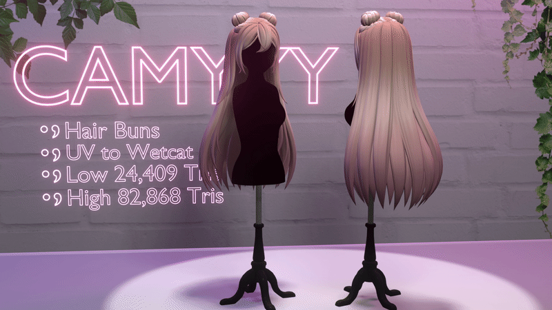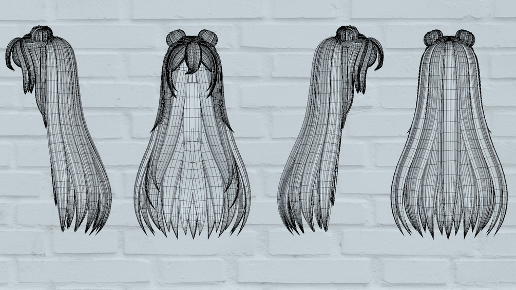 One material for each version. The hair comes with 12 custom-made hair textures. The hair works with a basic gradient for in-game emissions.